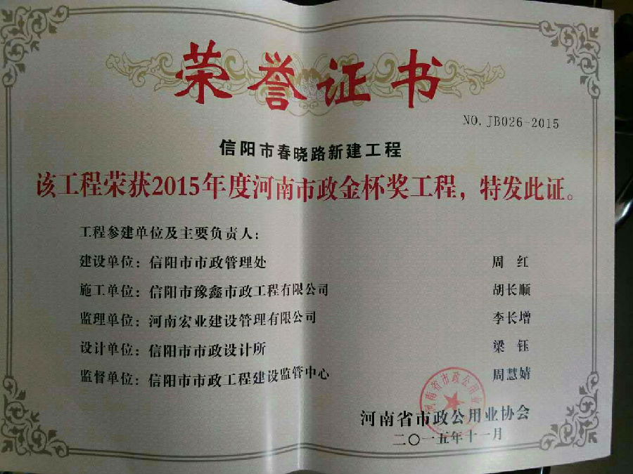 好風(fēng)憑借力,送我上青云。近年來,公司積極參與城市市政基礎(chǔ)設(shè)施建設(shè)施工,積極參與市場競爭,先后承擔(dān)施工了市政府重點(diǎn)工程南京路道路改造工程、春曉路道路改造工程,東方紅大道道路改造工程、龍江東路新建工程等重點(diǎn)民生工程,其中南京路道路改造工程被省建設(shè)廳評為“中州杯”, 春曉路和東方紅大道道路改造工程被省建設(shè)廳評為“省優(yōu)工程”,成為城區(qū)一道道亮麗的風(fēng)景線。參與施工了市典范小區(qū)“臺北城上城”、“恒大名都”以及師范學(xué)院、職業(yè)技術(shù)學(xué)院、交警支隊和軍區(qū)道路工程,參與施工了雞公山管理區(qū)、南灣管理區(qū)、明港鎮(zhèn)和羅山縣等部分道路小區(qū)工程施工,累計大小各類施工工程三百余項,企業(yè)影響力不斷擴(kuò)大、輻射力不斷增強(qiáng),市場份額不斷提高,企業(yè)信譽(yù)不斷彰顯,為信陽城市建設(shè)做出了積極貢獻(xiàn),為企業(yè)的可持續(xù)發(fā)展插上了騰飛的翅膀。